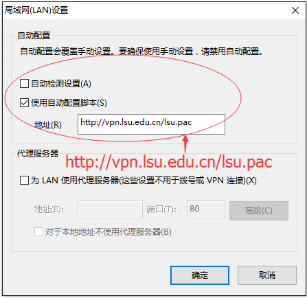 3.勾选“使用自动配置脚本”,输入地址:http://vpn.lsu.edu.cn/lsu.pac