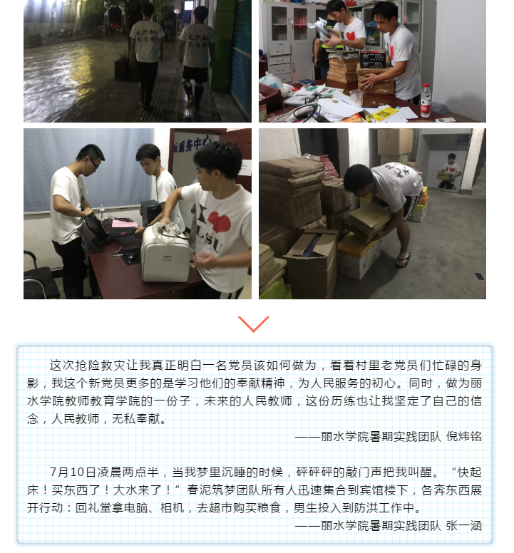 2019年7月10日,青春丽水微信公众号报道了教师教育学院暑期社会实践团队参与抗洪抢险后勤服务,成为“逆行青年”的事迹,并采访了团队成员倪炜铭、张一涵。