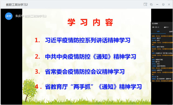 教职工政治学习网络直播会议后,中心又组织召开了党总支视频会议,深入学习省委办公厅《关于深化推进新时代高校党建工作的意见》、市委《关于充分发挥全市机关党组织和党员干部在新型冠状病毒防控工作中的战斗堡垒作用和先锋模范作用的通知》等文件精神,并研究部署本中心党建工作,审议通过了2020年度党总支工作要点、教职工政治理论学习计划以及理论学习中心组学习计划。
