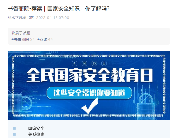 图书与信息服务中心通过“丽水学院图书馆”微信公众号,在向全校师生普及国家安全基础知识的同时,精心挑选、推荐《中国国家安全法教程》《国家安全法治问题研究》《中华人民共和国疫苗管理法》等有关国家安全的书籍。
