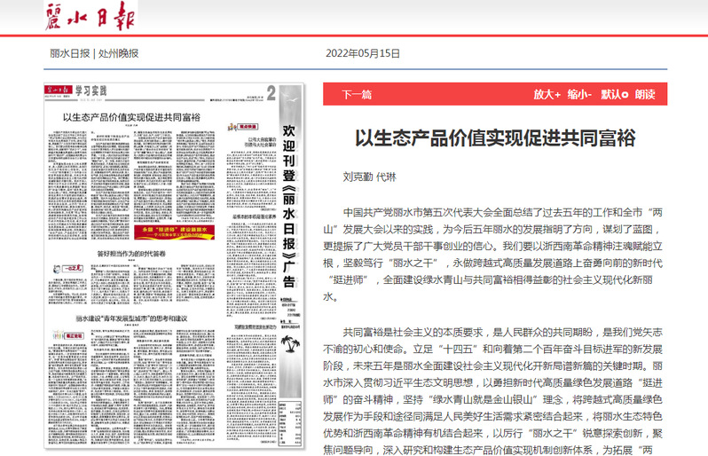 5月15日,丽水日报刊发了我校两山学院刘克勤、代琳两位老师合著的文章《以生态产品价值实现促进共同富裕》。