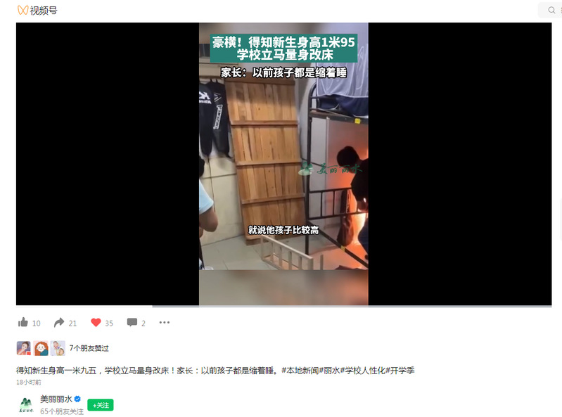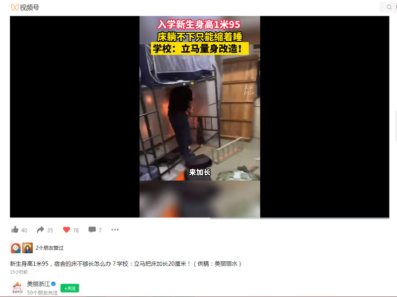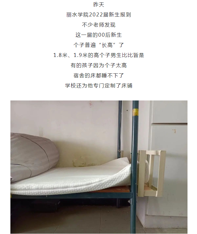 9月5日,浙江省人民政府新闻办公室视频号美丽浙江、中共丽水市委宣传部视频号美丽丽水、丽水日报集团处州晚报刊发了我校为身高1.95米的新生加长床铺的消息。
