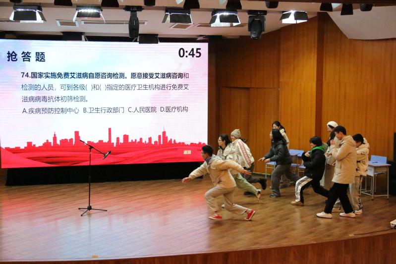 知识竞赛包括初赛和决赛环节。初赛采取现场随机抽题的方式,由主持人宣读题目,选手们通过举牌示意进行答题。决赛采取抢夺麦克风,快抢快答的形式进行。在观众互动环节,台下的同学们争先恐后,踊跃答题,活动现场掌声如雷,气氛活跃。