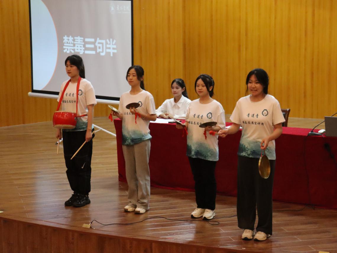 集中宣讲,普及禁毒防毒知识。“青莲青”禁毒志愿宣讲团在校园内展开禁毒防毒集中宣讲。宣讲员们现场普及各种毒品预防知识,还为同学们带来了精彩表演,将枯燥的禁毒知识化为生动有趣的三句半,读来朗朗上口、富有音韵美感,令人印象深刻。据悉,“青莲青”禁毒志愿宣讲团成立已有十二年,在校园内外开展禁毒宣传百余场,受益人数60000多人次,为丽水市和学校禁毒宣传工作做出了积极的贡献。2015年,被评为丽水市禁毒先进集体;2019年,在浙江省第三届妇女儿童公益服务项目创意大赛中获得全省二等奖,同年荣获浙江省暑期社会实践风采大赛优秀团队。