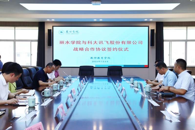 为进一步深化产教融合,强化教育数字赋能,构建校企协同育人机制,7月5日,我校与科大讯飞股份有限公司举行战略合作协议签约仪式。科大讯飞股份有限公司副总裁、浙江讯飞智能科技有限公司总经理孙东平,浙江讯飞智能科技有限公司教育业务部浙南地区区域总监周中蒙,浙江讯飞智能科技有限公司教育业务部丽水城市经理殷安新,我校科研与地方合作处、教师教育学院相关负责人出席活动。
