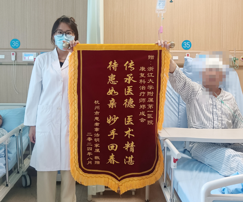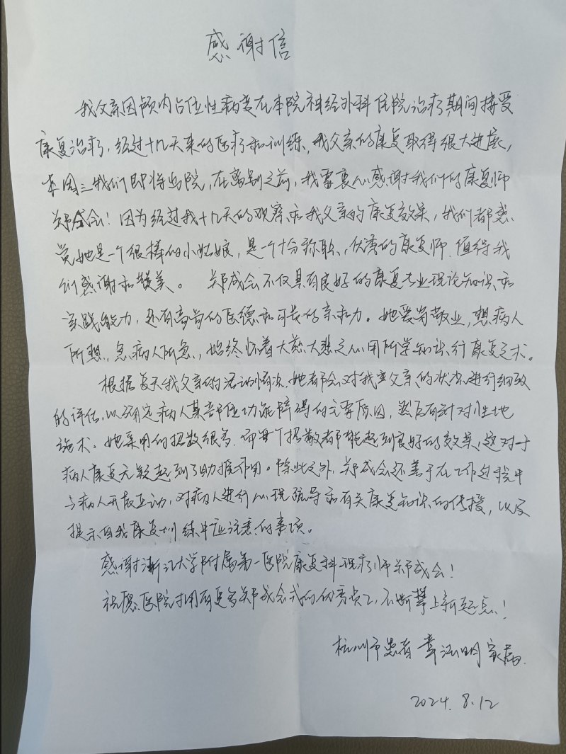 近日,医学院康复治疗学21郑成会同学在浙江大学附属第一医院实习期间,其出色表现赢得了患者及家属的广泛赞誉,并收到一名患者家属的手书感谢信与锦旗。