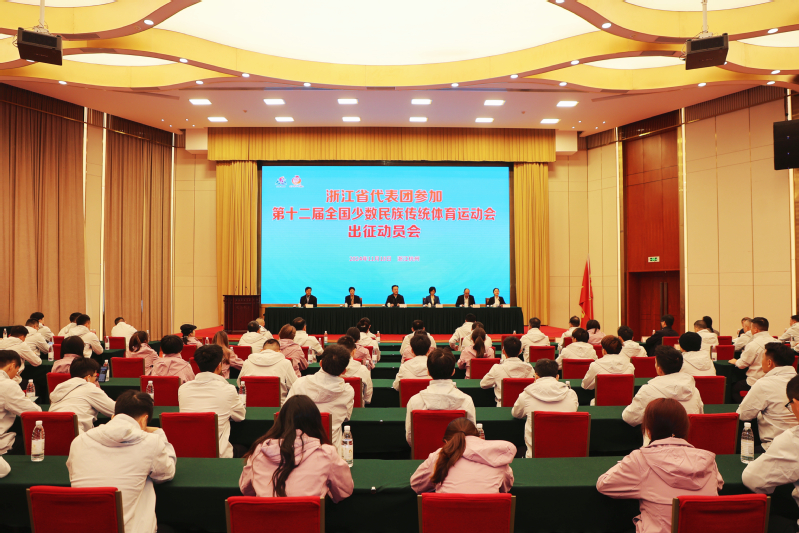 11月18日上午,我校民族体育健儿赴杭州参加浙江省代表团出征动员会。省民宗委副主任金伟,省体育局局长金志,省委统战部副部长、省民宗委主任鲍秀英,副省长、省公安厅党委书记、厅长杨青玖出席。