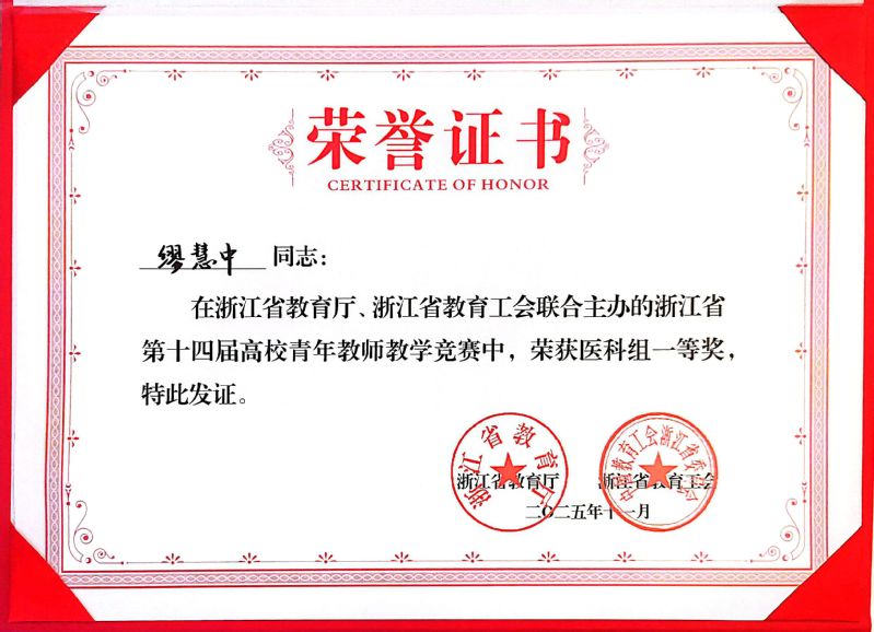 桃李芬芳,杏林增辉!11月14日-17日,浙江省第十四届高校青年教师教学竞赛在宁波大学举行。我校医学院缪慧中老师凭借扎实的教学功底、新颖的教学设计和精湛的课堂呈现,斩获医科组一等奖,充分展现了我校青年教师的专业素养与教学风采,为学校赢得荣誉。