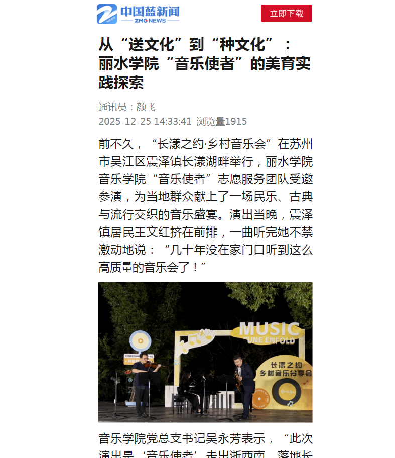 12月25日,中国蓝新闻以《从“送文化”到“种文化”:丽水学院“音乐使者”的美育实践探索》为题,专文报道了我校音乐学院“音乐使者”志愿服务团队深耕基层、以乐化人的先进事迹,有力展现了高校服务地方文化建设的创新实践与使命担当。