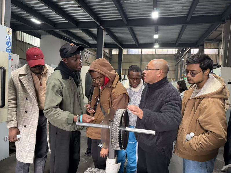 座谈会后,师生一行实地走访了浙江先锋工具、浙江骏业工具两家精密磨具制造企业,以及专注于智能锁具研发制造的浙江科熊智能科技有限公司。企业负责人详细介绍了公司核心竞争力、市场定位与外贸业务,留学生们深入生产车间、研发中心与产品展示厅,全程观摩从原材料到精密成品的制造流程,对“中国智造”与外贸出口运作模式有了直观而深刻的认识。