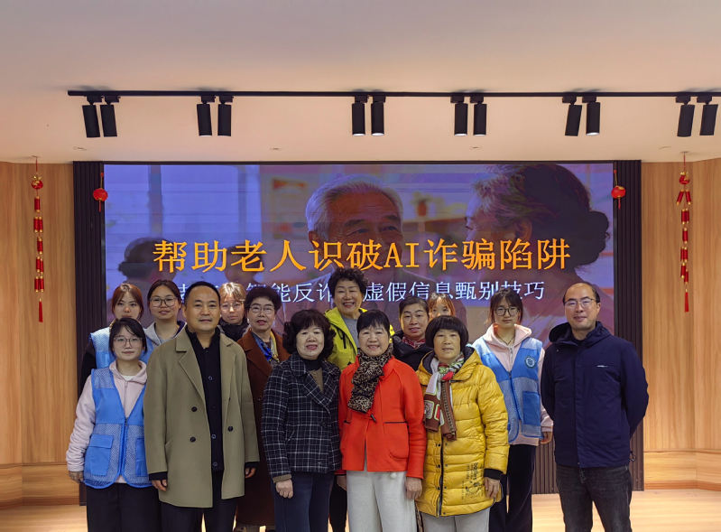 近日,人工智能学院计算机专业教师带领学院志愿者走进陈道门社区,开展“智助银龄·反诈护航”雷锋月主题活动。活动通过专题讲座与智能手机使用指导相结合的方式,为社区30余位老年人普及AI防骗知识,帮助老年人提升识骗防骗能力。