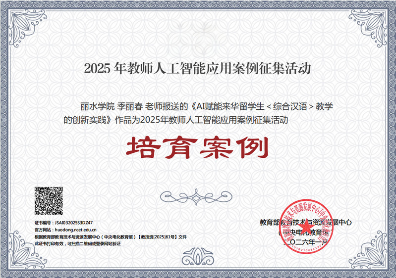 近日,教育部教育技术与资源发展中心(中央电化教育馆)正式揭晓2025年教师人工智能应用案例征集活动的评选结果。我校人文学院季丽春老师申报的《AI赋能来华留学生〈综合汉语〉教学的创新实践》案例成功入选培育案例类别名单。