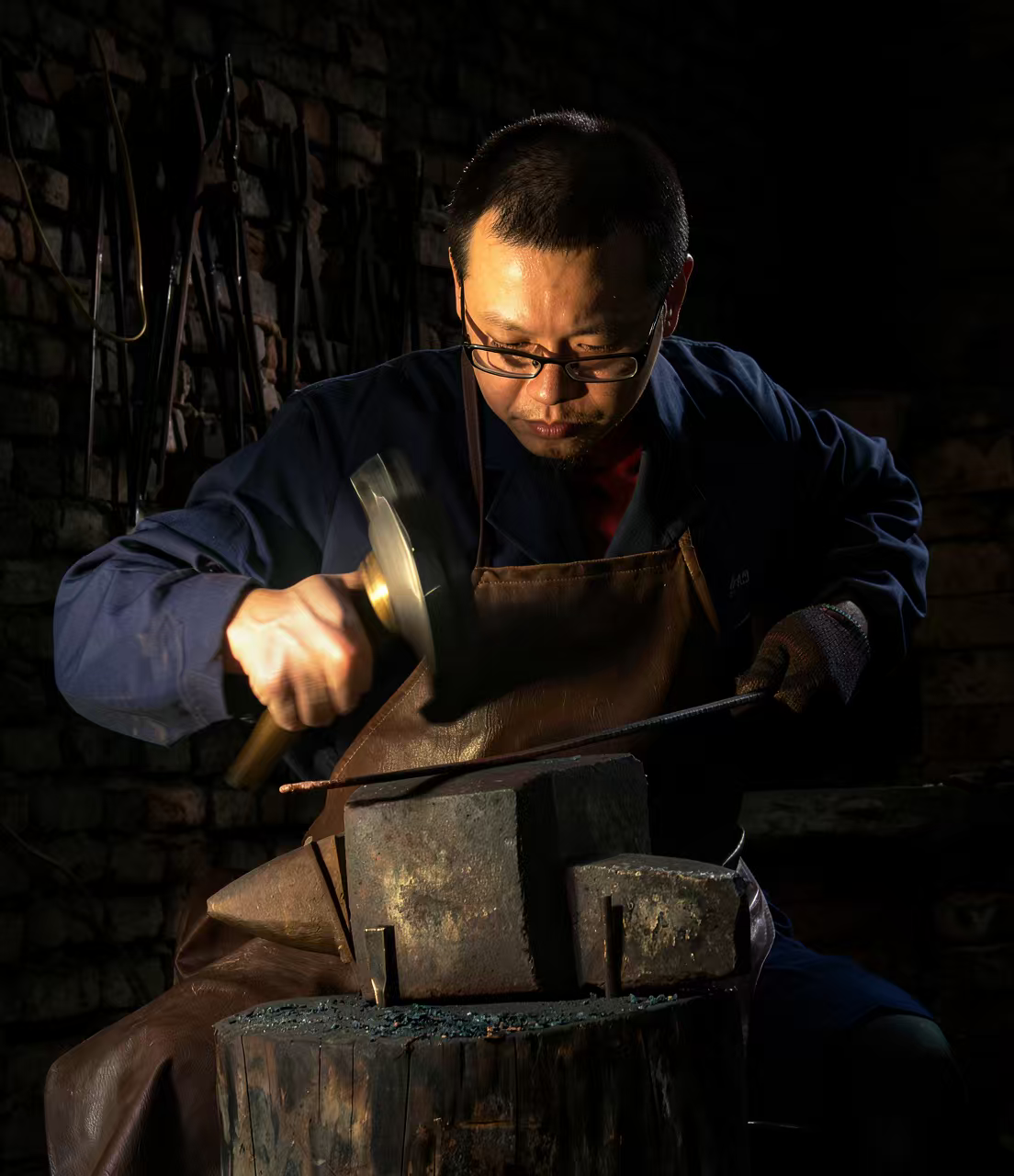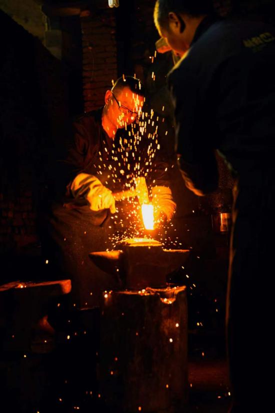 为了这份信念,他毅然放弃安稳工作,远赴大连潜心学习古法铸剑8年。求学之路满是艰辛,他租住在柴间省开支,倒几趟车去农村农具打铁铺练技艺,只因那里保留着最古老的锻打手法。2000年大连遭遇极寒,零下20多度的漏风柴间无暖气,他裹尽衣物仍冻得手脚、耳朵冻疮开裂,却从不敢告知父母。前途的迷茫也曾让他想放弃,恩师一句“喜欢的事就坚持”,成了他撑下去的力量。